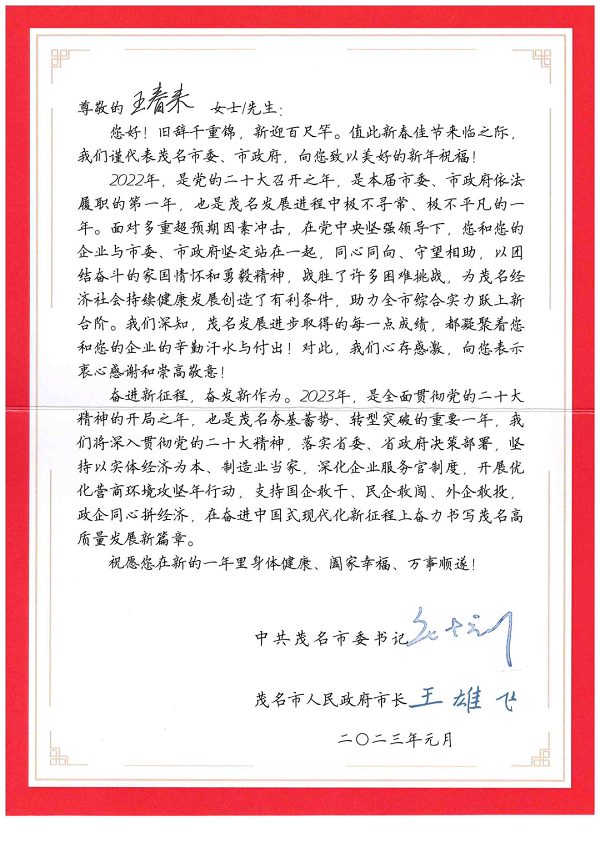 1月19日,中國能源工程集團有限公司(以下簡稱“中國能源工程集團”)所屬中機科技發展(茂名)有限公司(以下簡稱“中機茂名”),收到茂名市生態環境局代表茂名市人民政府送出的感謝信,對公司為茂名經濟社會持續健康發展做出的貢獻表示感謝。