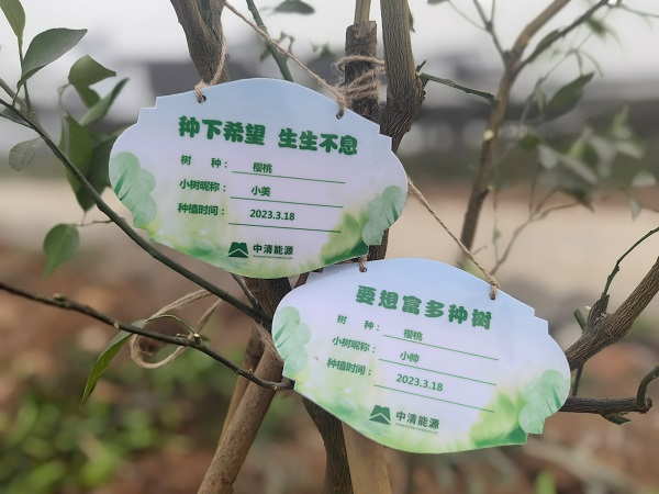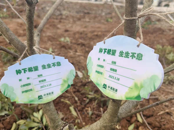 在栽種現(xiàn)場(chǎng),職工們配合默契、忙碌有序,或提著水桶、或捧著小樹苗、或端著鐵鍬忙碌在植樹間,員工們還給自己種下的小樹命名,為自己種的樹苗賦予了更多的意義。經(jīng)過一個(gè)下午的勞動(dòng),楊梅、枇杷、紅美人等40多棵樹苗順利在安吉光伏項(xiàng)目“安家落戶”。